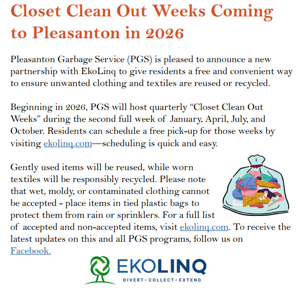 Starting January 2026, Pleasanton Garbage Service is partnering with EkoLinq to provide FREE quarterly pick-ups of unwanted clothing and household textiles for Pleasanton residents.